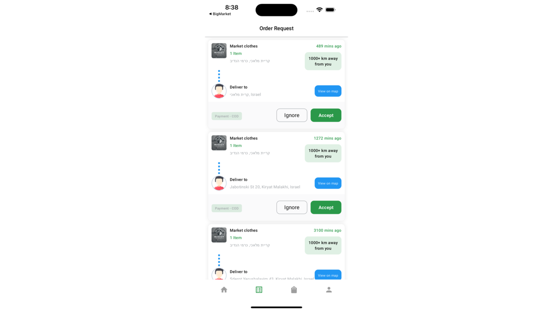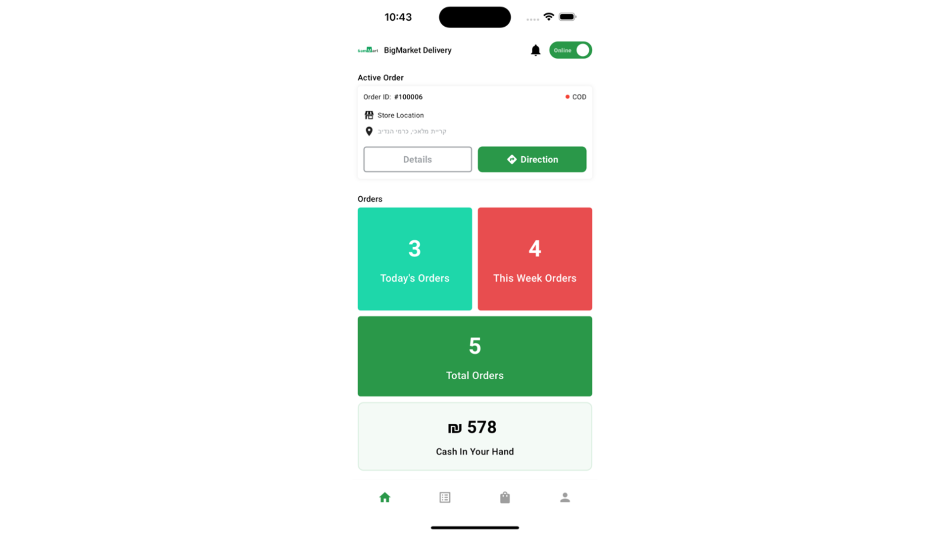 אחד מהחידושים המרכזיים של BigMarket הוא מודל השליחים הגמיש. כל אדם יכול להירשם כשליח, לבחור מתי נוח לו לעבוד, ולהצטרף לשירותים שונים – בין אם זה עבודה מול חנות ספציפית ובין אם לכלל המערכת. השליח מקבל עדכונים על הזמנות חדשות, יכול לעקוב אחרי הכתובת, ומקבל תשלום על כל משלוח בצורה שקופה.